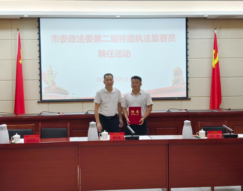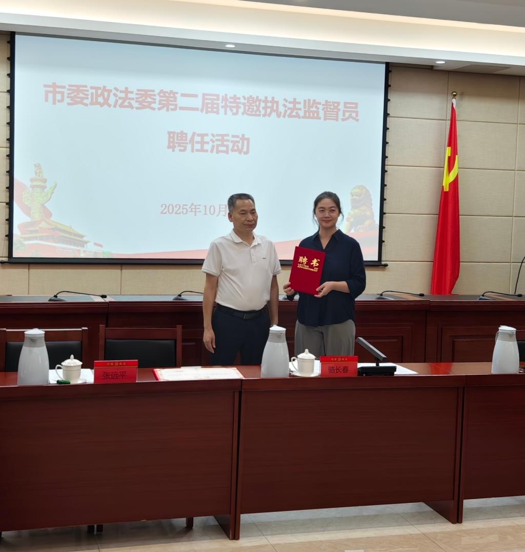 10月31日,河源市委政法委举行第二届特邀执法监督员聘任活动。此次聘任活动是市委政法委深化执法监督体制改革、拓宽社会监督渠道的重要举措,旨在通过吸纳人大代表、政协委员、专家学者等各界力量,以第三方独立视角强化执法监督,推动执法行为更加规范、透明、公正。