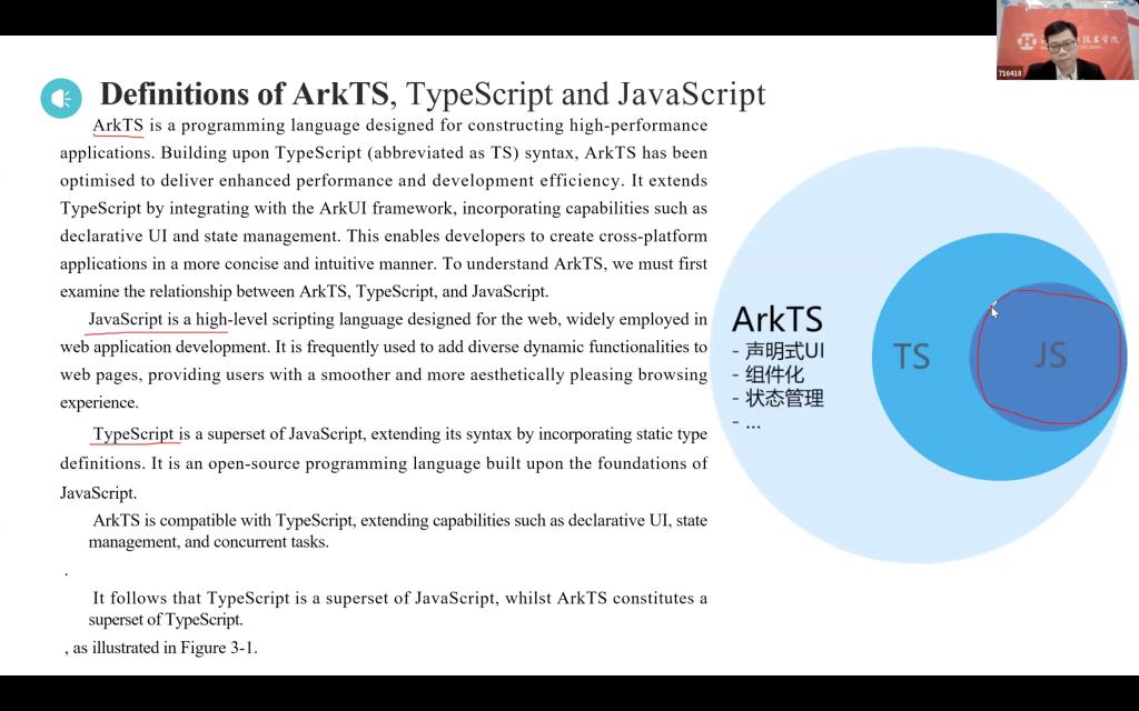 培训过程中,授课教师以鸿蒙生态开发技术为核心,构建阶梯式教学模块:从HarmonyOS概述与开发环境搭建切入,帮助学员实现从0到1的突破;通过TypeScript核心语法精讲夯实编程基础;依托ArkUI开发框架教学传递声明式UI开发理念;最终结合实战案例演练提升学员解决实际问题的能力。教学团队创新融合中国职业教育“理实一体化”教学模式与华为技术标准,为学员提供全方位教学支撑。