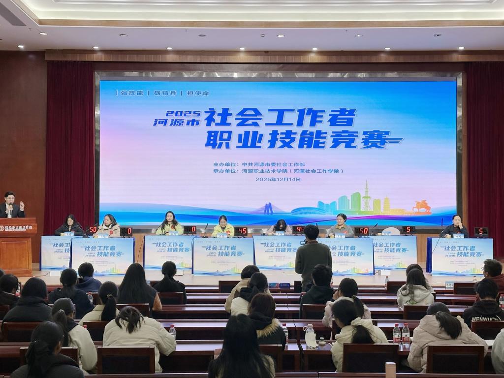 12 月 14 日,由河源市委社会工作部主办、我校承办的 2025 年河源市社会工作者职业技能竞赛在学术交流中心报告厅成功举办。市委社会工作部部长、市委 “两新”工委书记朱永生,我校副校长姚家芳,市委社会工作部副部长彭志波出席活动并为获奖选手颁奖。