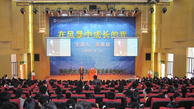 在谈及金融危机的影响,吴先生认为,金融危机不是件坏事,谁在金融危机影响下打好基础,谁就成功。金融危机是给我们休养生息时候,是大家一起“玩”的时候,要自强不息,抓住机会,争取养息后以更昂扬的姿态为河源人、为客家人、为广东人、为中国人争气。 吴博士与现场的同学进行了互动交流,同学们就现今大学生就业心态、怎样拥有自信心、如何坚定信心等问题向吴博士求教,他一一耐心细致地作了解答,吴博士热情洋溢、真实质朴的精彩讲座博得了在场同学们十分热烈的掌声。