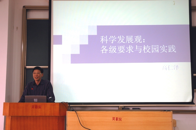 4月2日下午,我校党委书记高仁泽在教学楼D206会议室举行《科学发展观:各级要求与校园实践》讲座。参会人员包括副校长陈德清、黄向明以及全体党员教职工、部分民主党派和无党派人士。