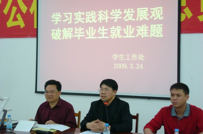 为了响应我校深入学习实践科学发展观活动的号召,认真贯彻“广东省2009年普通高校毕业生就业工作会议”精神,进一步搞好我校毕业生就业工作,学校于3月24日下午在就业中心召开了“学习实践科学发展观,破解毕业生就业难题”专题会议,校长刘安华、党委副书记韦荣出席会议并发表讲话,参加会议的有学工处相关人员、各院系副书记、辅导员、学生代表等,会议由学工处负责人主持。