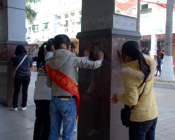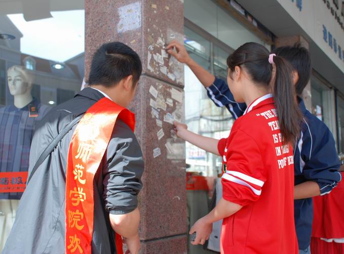 3月14日,我校师范学院青年志愿者服务队和学生会代表走上市区,走进街道,对卫生“死角”、“牛皮癣”等黑色广告进行清理。