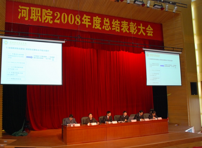 会上,刘校长对学校2008年整体工作作了系统性的总结,其中包括对照评估专家组的反馈意见扎实整改;申报创建省级示范性高等职业院校建设项目顺利推进;加强师资队伍建设,师资队伍整体水平稳步提升;大力推进教学建设,强化质量监控,促进了教学质量的提高;德育工作取得显著成效;学校管理水平大幅提升;强化就业指导工作,实现招生和就业的良性循环;科技创新和社会服务取得新突破;后勤服务呈现新亮点;继续教育迅猛发展;加强党建和校园文化建设,推动学校精神文明建设跃上新台阶;以及主要不足共12方面。刘校长表示,总体而言,学校坚持以科学发展观为指导,继续保持开拓进取的锐气和良性发展的态势,强化内涵建设,加强管理,扎实工作,干净干事,学校各项工作取得了显著成效。