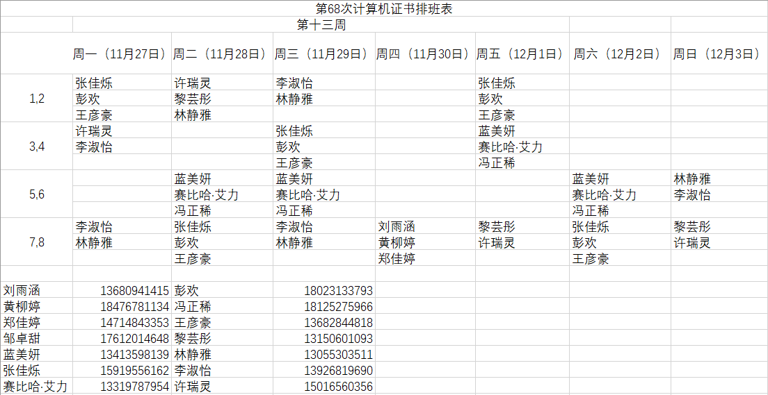 2023年3月(第68次)全国计算机等级考试合格证书现已到我校,请通过第68次全国计算机等级考试的考生,自2023年11月27日起至2023年12月3日到电子与信息工程学院实训楼A309集中领取证书(因部分时段有课无法安排发放证书,请各位考生在下表有排班时段内过来领取),本校考生以班级为代表进行领取,班长或学委统一代领回去,请各位考生尽量在集中领取时段内领取证书。