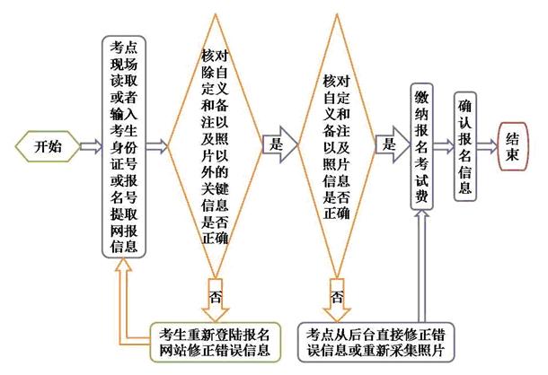 2.网上报名提交成功后,考生须在规定时间内到本考点(考点代码:440077)进行现场校验、确认报名信息并缴交报名费用。校验时,考生务必仔细校对报名信息,如发现报考信息错误,考生必须自行登录网上报名系统修改(自定义信息、备注信息和照片信息由考点后台直接重新采集修改除外)。核准报名信息无误后,考生现场缴费,并在报名登记表(考点留存联)上签字确认。考生现场确认流程如下: