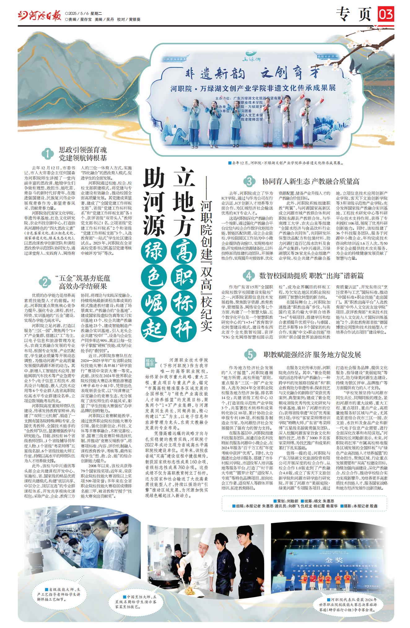 5月6日,河源日报第三版整版专栏以《助绿美河源崛起立地方高职标杆》为题,深度报道了我校“双高”校建设成果,全面展现了我校在职业教育领域的亮眼成绩与积极贡献,引发广泛关注。