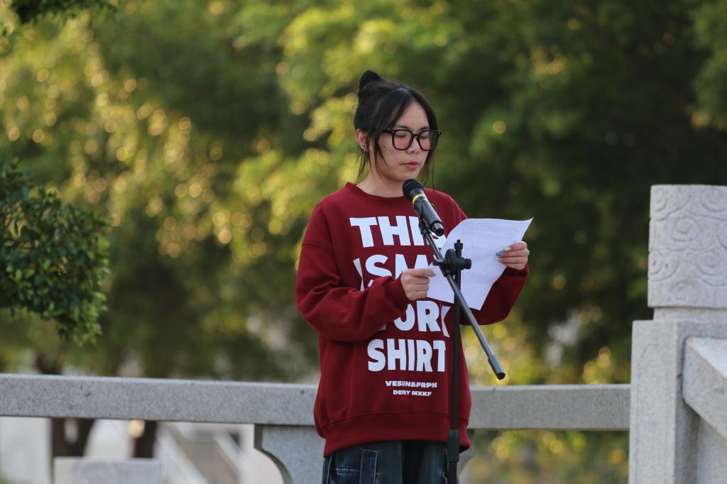 升旗仪式后,电信学院团委学生会主席丘鑫巧作为学生代表进行发言。她以“雷锋月”系列活动为切入点,回顾了志愿者们在消防赛事保障、校园环境维护、学风建设及社区服务中的动人身影,强调“雷锋精神是永不褪色的青春底色”。她呼吁全体同学从点滴做起,以行动践行“奉献、友爱、互助、进步”的志愿精神。