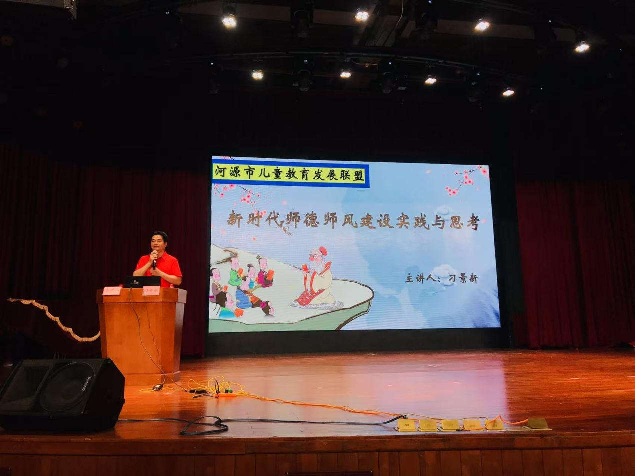 2025年5月21日晚上,艺术楼演播厅内座无虚席,由河源市儿童教育发展联盟主办的“新时代师德师风建设实践与思考”专题讲座在此隆重举行。河源市儿童教育发展联盟成员,源城区下城小学的党支部书记、校长刁景新为2023级师范生带来一场理论与实践深度融合的精彩讲座。