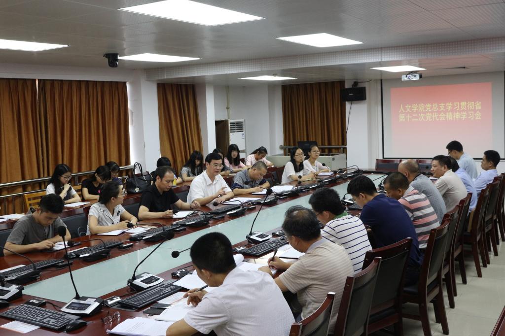 2017年6月19日下午,人文学院党总支在行政楼B601召开学习贯彻广东省第十二次党代会精神会议,会议由人文学院党总支纪检委员谢战锋主持。学校党委段邦贤书记、党政办公室黄建华主任、人文学院全体党员出席会议。