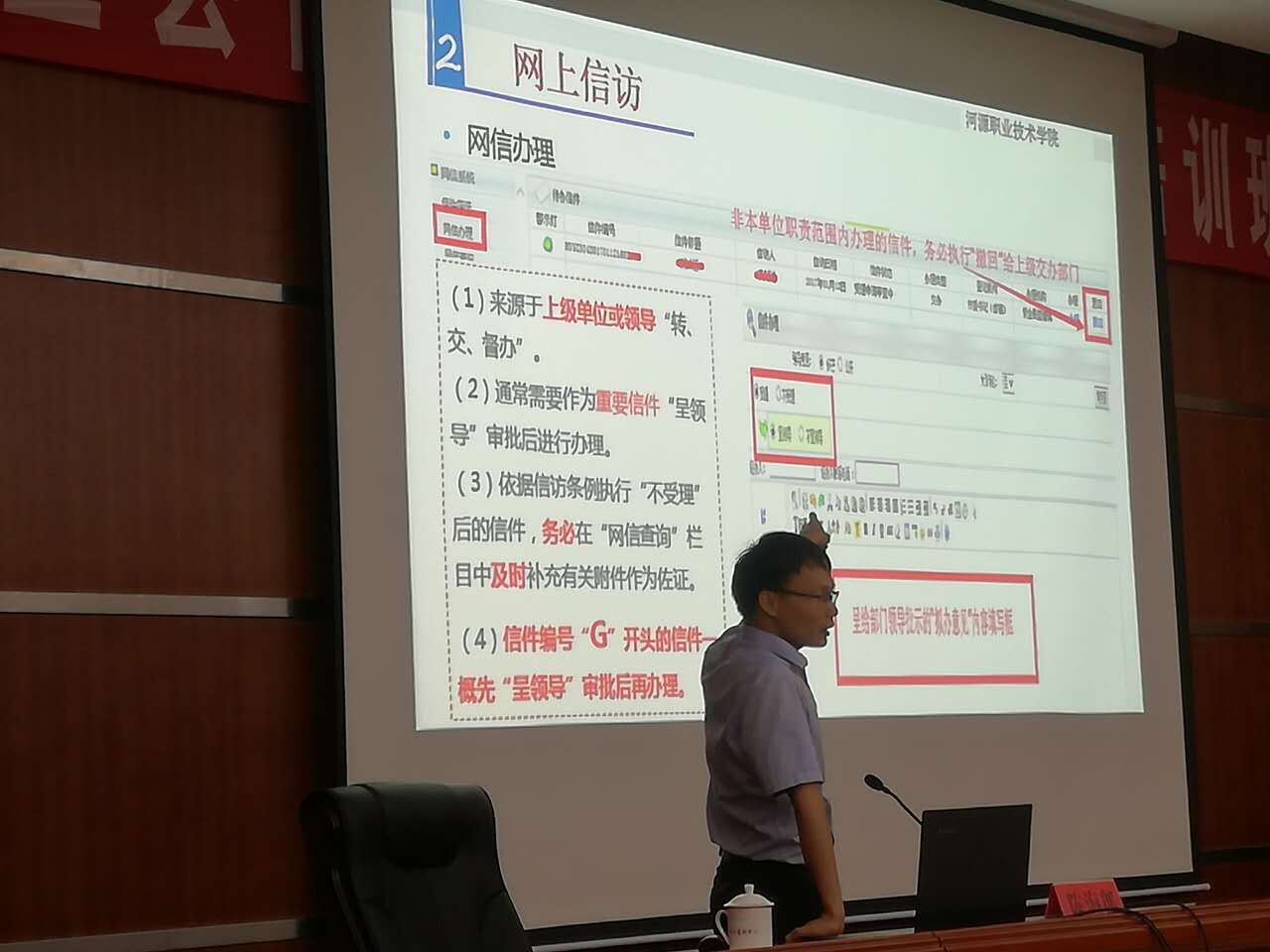 在培训现场,我校人员分别对我市当前网络信访现状、河源市信访综合平台操作流程和工作规范等进行了详细讲解。培训中,我校人员进行了辅导,解决了受训人员信访工作中的实际问题,受到好评。