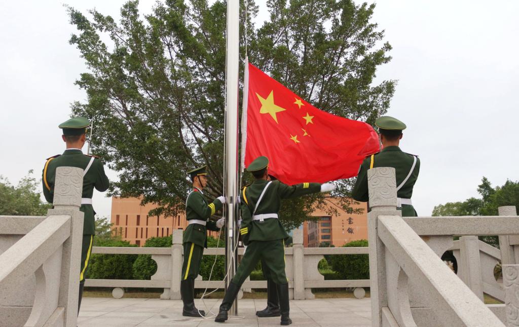 升旗仪式上,国旗护卫队的旗手们着装整齐,踏着铿锵有力的正步,护着鲜艳的五星红旗入场。伴着慷慨激昂《义勇军进行曲》,五星红旗在全体师生的注目下冉冉升起。