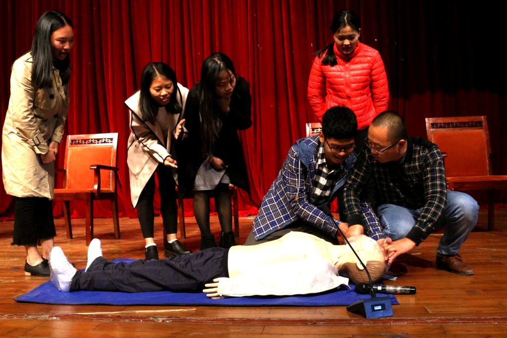 李胜军医师向全体学员做了自我介绍后,向学员们讲解了安全应急救护的基本知识,展示“拍病者、听呼吸、叫人打电话、按压心脏、扣口中异物、人工呼吸”等一系列正确急救措施。接着,李胜军医师邀请学员们上台依次在仿真人体上演练应急救护措施。此外,李医师还教授了学员们遇到突发事件的创伤止血与包扎方法,包扎考验的是救护者的耐心以及动手能力。