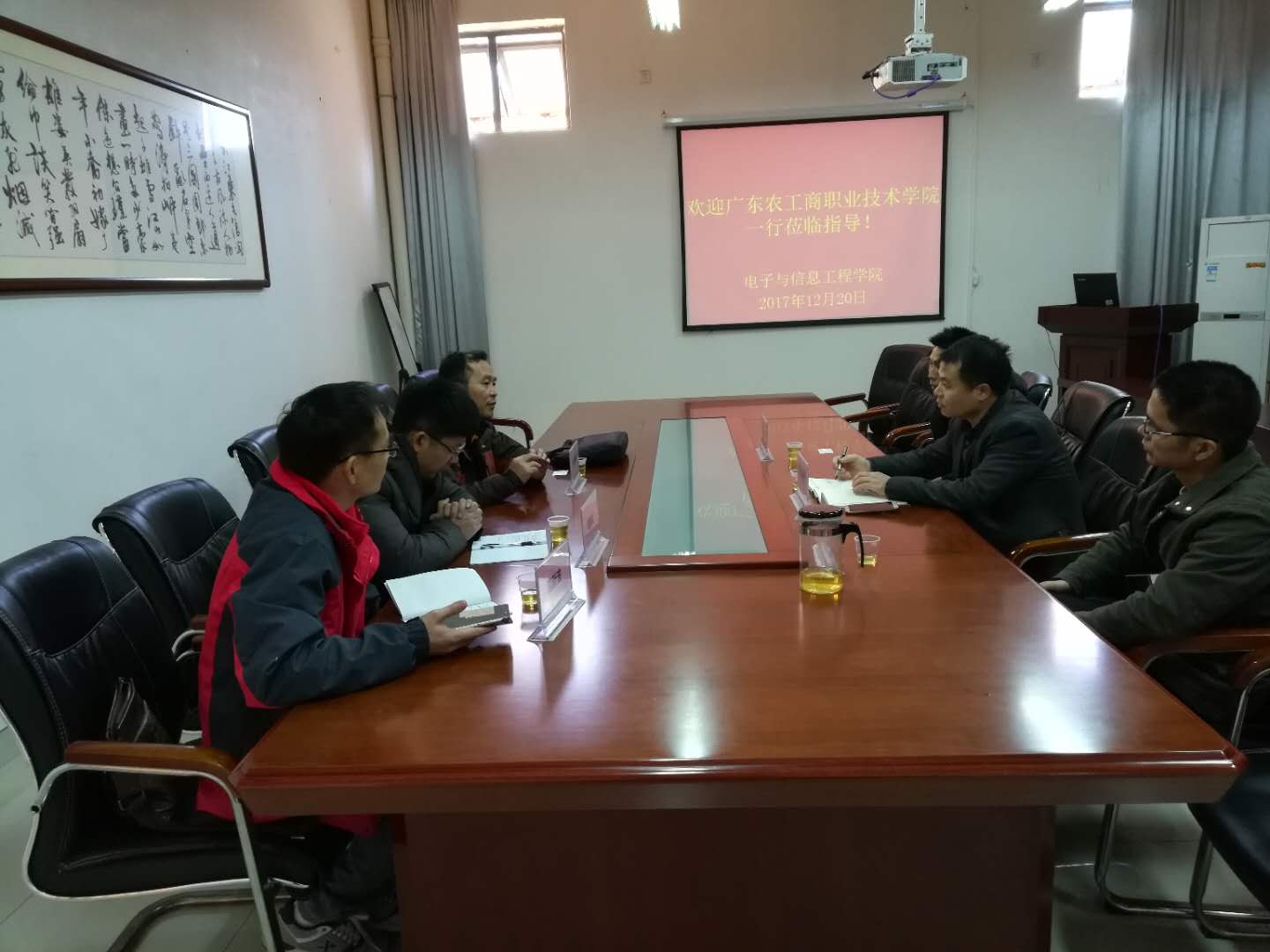 2017年12月20,广东农工商职业技术学院一行莅临我校参观交流。我校电信学院周永福副院长热情接待了来访客人,并在学院会议室进行交流。