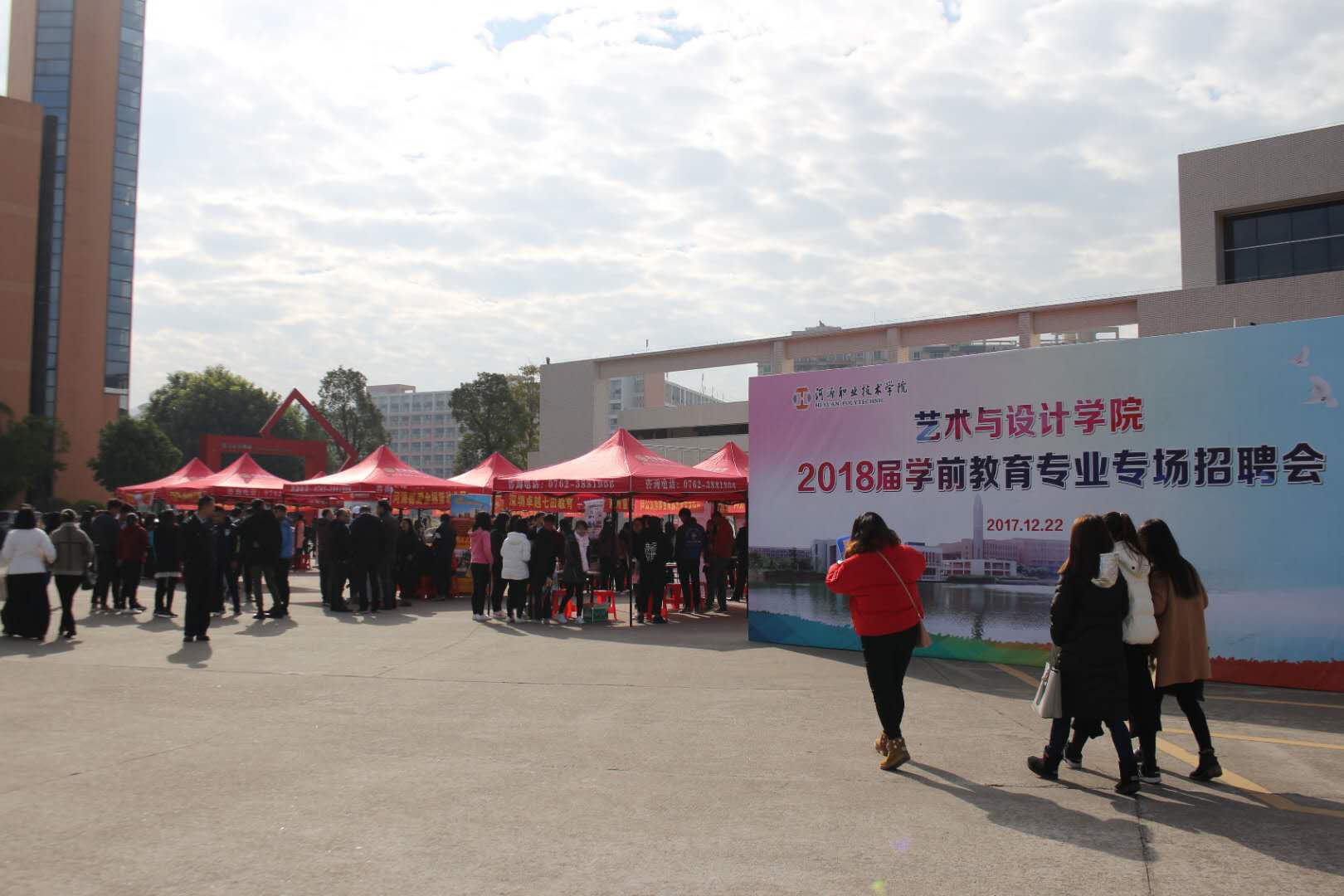 2017年12月22日上午,艺术与设计学院学前教育专业专场招聘会在学校的艺术楼举行,30家用人单位参加此招聘会,学校就业指导中心主任柳晓夫、学院团总支书记张超、学前专业老师以及辅导员出席招聘会并进行现场指导。