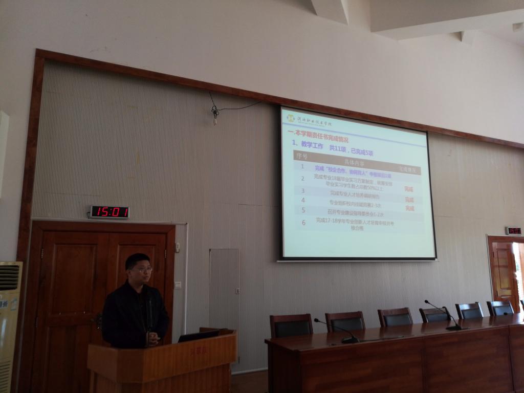 会上,首先由各专业、实训部、校企办、学工团队、办公室负责人从本学期责任书完成情况,本学期责任书完成措施,本学期工作亮点三方面内容进行汇报。然后,杨黎院长进行点评,指出学院各专业发展不平衡、不充分,主要体现在专业成果、科研成果、校企合作等方面的不平衡;教学质量、教师科研水平、行政管理人员服务水平等方面的不充分,有待提高。并提醒各教职工要居安思危,提高忧患意识。