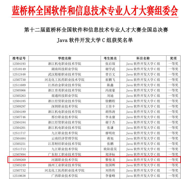 近日,第十二届“蓝桥杯”全国软件和信息技术专业人才大赛全国总决赛结果揭晓,我校参赛学生中,电信学院19大数据2班黎俊龙同学斩获软件类Java开发组一等奖,张楚城、张志航分别获得Java开发组、C/C++程序设计组三等奖的好成绩,实现我校在该赛项国赛一等奖零的突破!