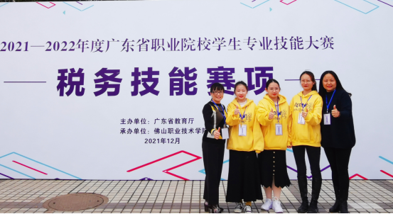 2021年12月25日,2021-2022年度广东省职业院校学生专业技能大赛税务技能赛项佛山职业技术学院举行。我校大数据与会计专业学生温明慧、叶晓珊、林紫怡以及姜庆、张森芳两位指导老师组队参加比赛。我校代表队在全省58支参赛队伍中排名第二(第一名为东道主佛山职业技术学院代表队),荣获等奖,我校连续两年获得该赛项一等奖。